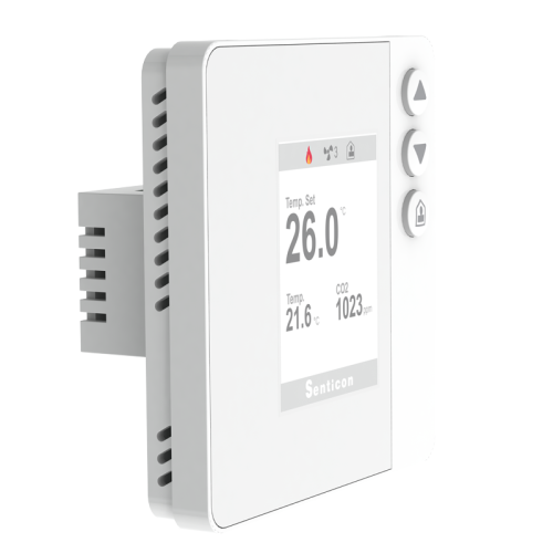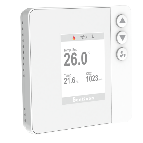 The room controllers have colour LCD screen indicating the current measurement and controller operating status. The user can adjust the setpoint and fan speed/boost/operating mode through the push buttons. The controllers are mounted on the wall surface directly or to standard wall mounting boxes. The controllers have built-in Modbus RS485 communication that allow interaction to the BMS systems.